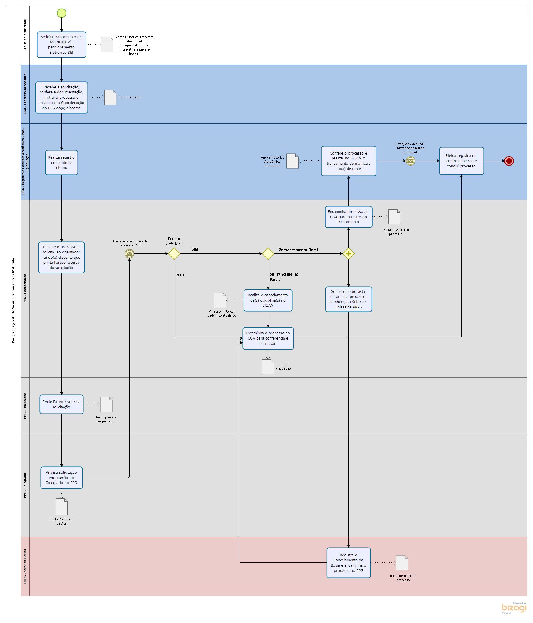 8.1.1 PPG - Coordenação: envia o processo ao CGA com despacho solicitando o registro do trancamento no SIGAA e, se o aluno for bolsista, enviar o processo, também ao setor de bolsas da PRPG para cancelamento da bolsa, conforme previsto no art. 55 § 6º do Regulamento Geral dos Programas de Pós-graduação Stricto Sensu;